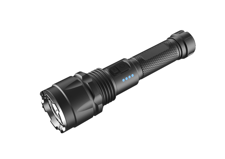 Multifunctional rechargeable flashlight night hunting, defensive with attacking head. Double Switch: 1, ON/OFF. 2, One Touch Strobe Power Display